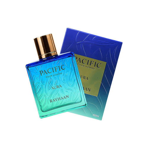 Pacific Aura de Rayhaan es una fragancia de la familia olfativa Aromática Acuática para Hombres. Esta fragrancia es nueva. Pacific Aura se lanzó en 2025. Las Notas de Salida son mandarina, menta, cidra, bergamota, grosellas negras y cilantro; las Notas de Corazón son albahaca, zanahoria y rosa; las Notas de Fondo son ambroxan, higo y ámbar.